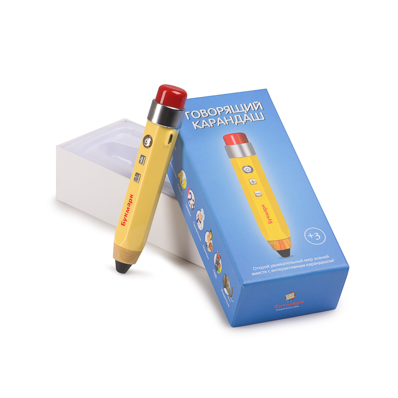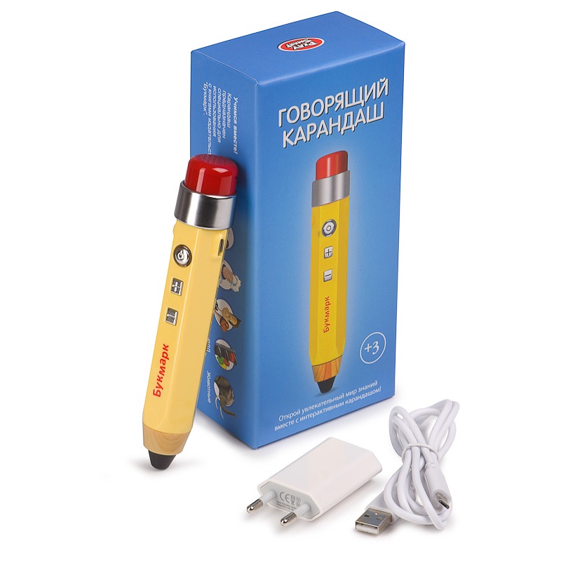 Прикасаясь его рабочим концом к иллюстрации в книге, можно воспроизводить различные аудиозаписи, а также переключать книгу в режим интересного факта или проверочный режим, что делает занятия еще более увлекательными. Чтобы несколько детей могли заниматься по книгам из набора одновременно, достаточно купить каждому из них свой карандаш. При этом, чтобы не мешать друг другу и взрослым, аудиозаписи они могут слушать через наушники, подключаемые к карандашу. О том, что разрядился, карандаш подскажет звуковым сигналом и, если на него никто не обратит внимания, просто выключится. Заряжается карандаш через USB-кабель, подключенный одним концом к нему, а другим – к компьютеру или розетке 220 Вт.